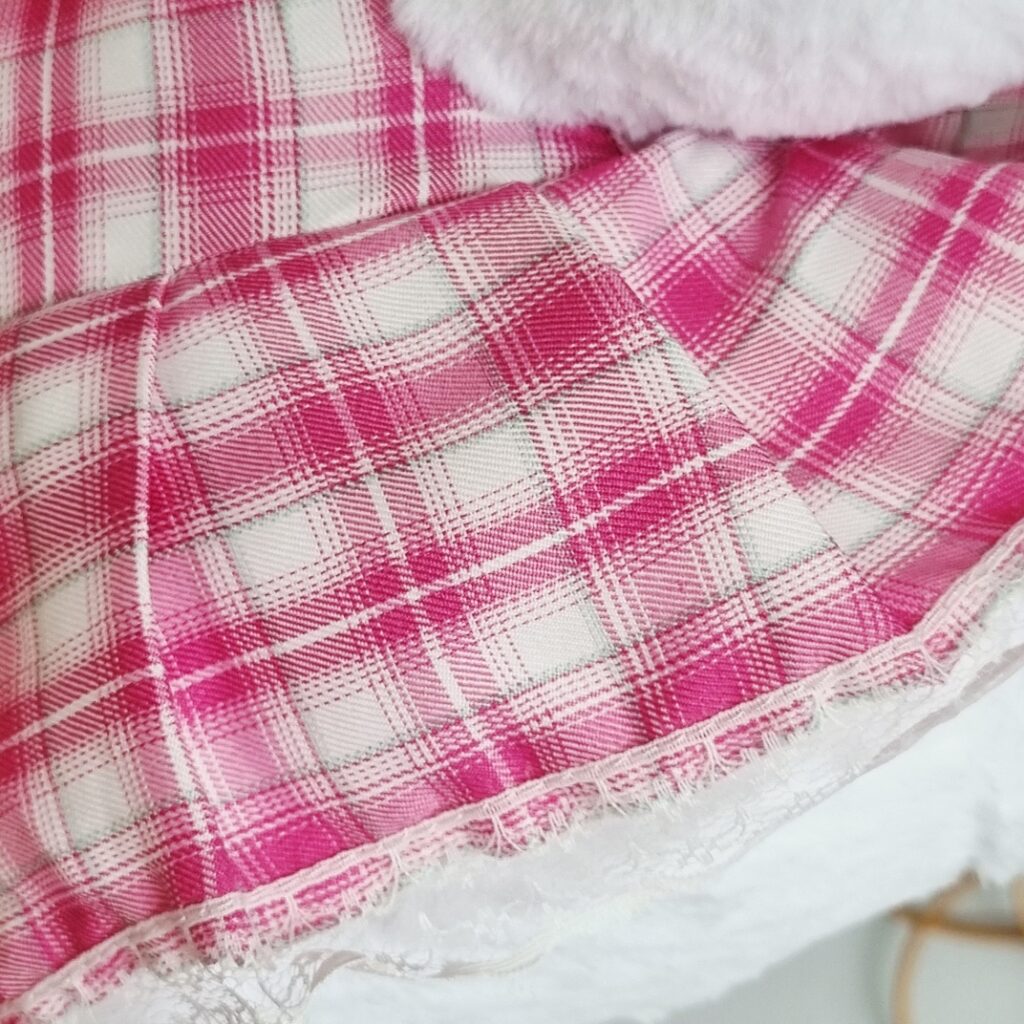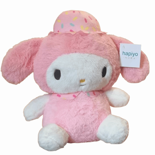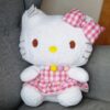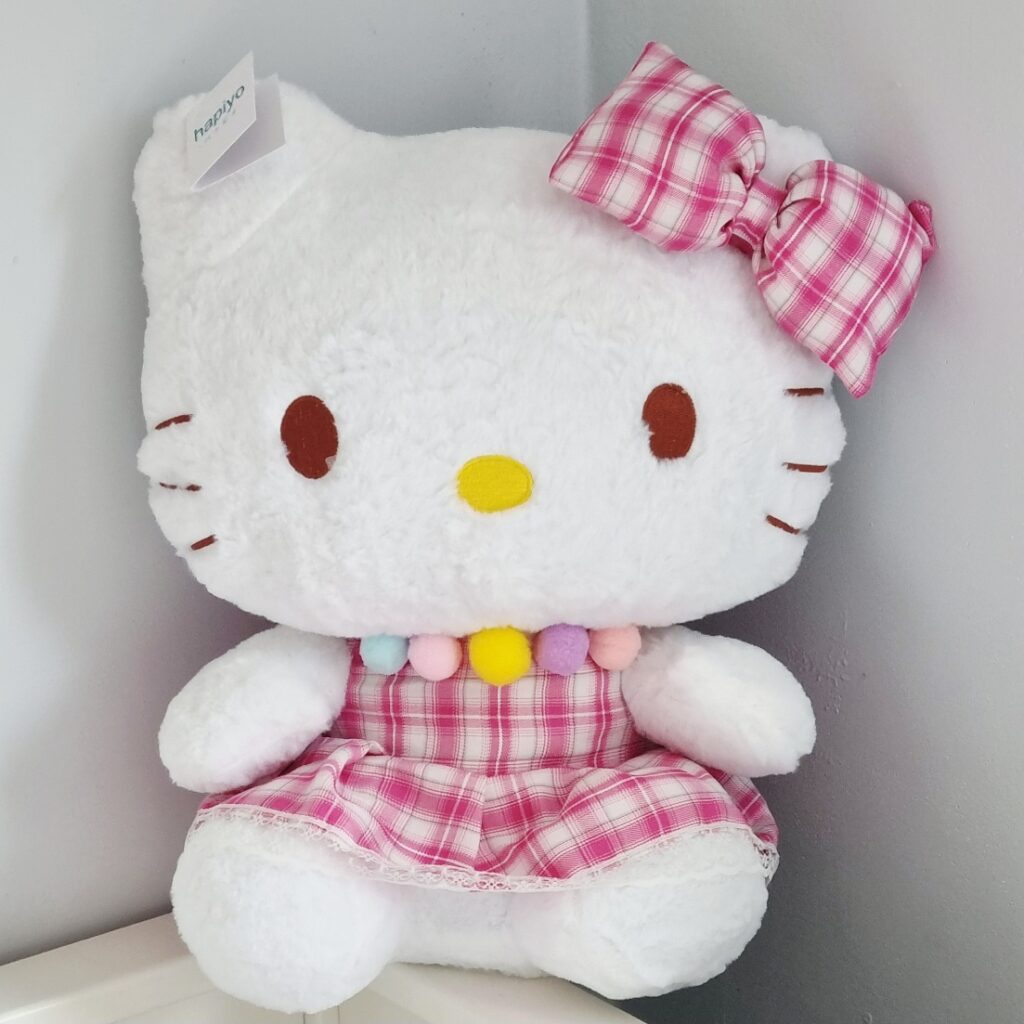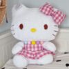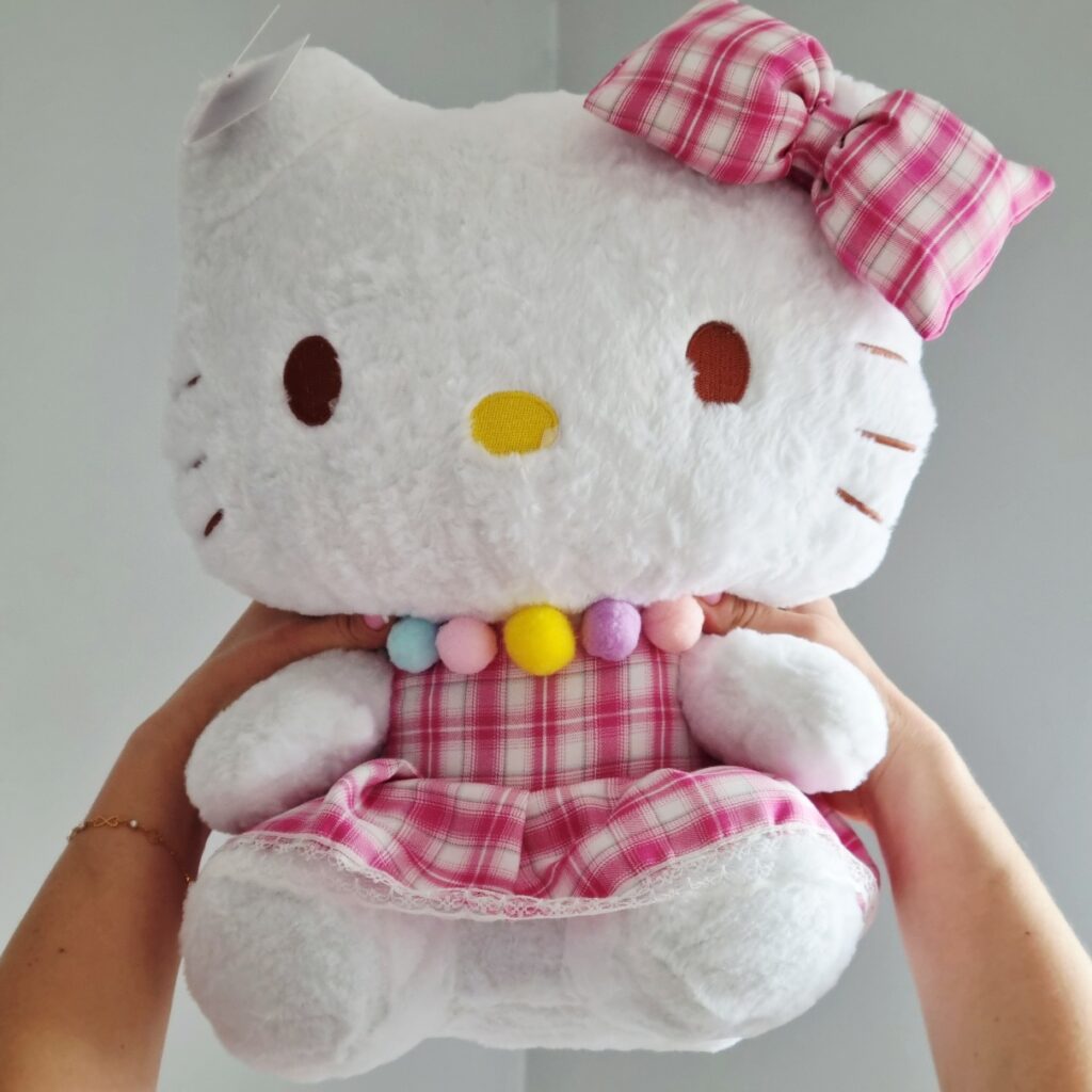 Poznajcie uroczą maskotkę HELLO KITTY w której można zakochać się od pierwszego wejrzenia. Jest to pluszak o brązowych oczkach i żółtym nosku. Ubrany w piękną różową sukienkę w kratkę a na szyi ma zawieszone pomponikowe korale.