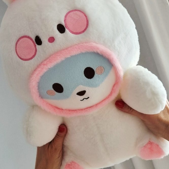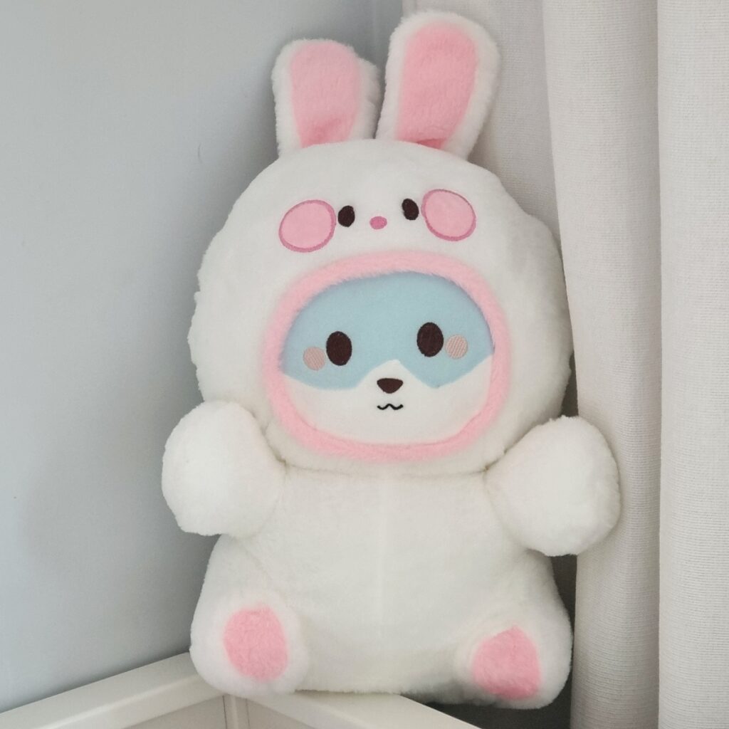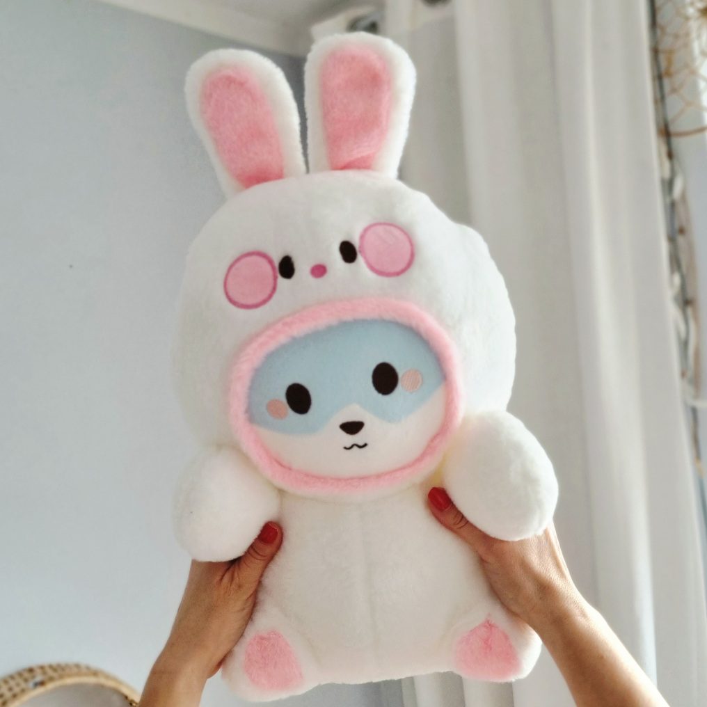 Poznajcie uroczą maskotkę pluszową pieska shibe w przebraniu królika w którym zakochasz się od pierwszego wejrzenia.
