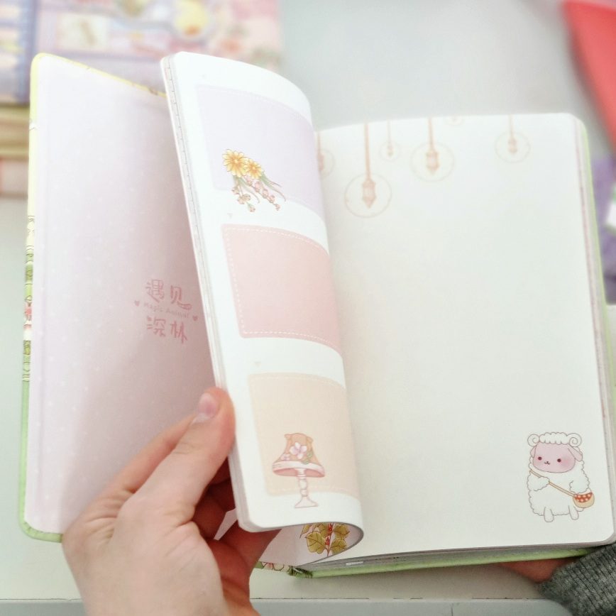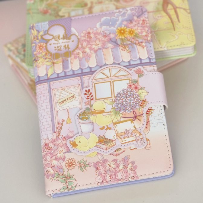 Poznajcie nasz piękny notatnik, notes w skóropodobnej oprawie z serii Magic Animal. Głównym motywem notesu są zwierzątka i roślinki w stylu kawaii. Okładka przedstawia scenę z kaczuszką, kwiatami i elementami architektury w delikatnej , różowo-fioletowej kolorystyce.