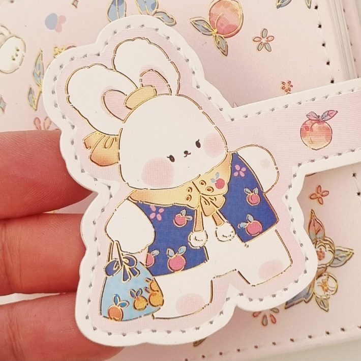 - design pełen uroku: okładka w delikatnym pastelowym odcieniu różu z motywem królika otoczonego brzoskwinkami. Całość ozdobiona subtelnymi błyszczącymi detalami.